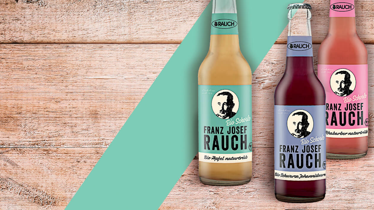 Franz Josef Rauch Bio Schorle Apfel naturtrüb, Schwarze Johannisbeere sowie Rhabarber naturtrüb und in der trendigen Longneckflasche.